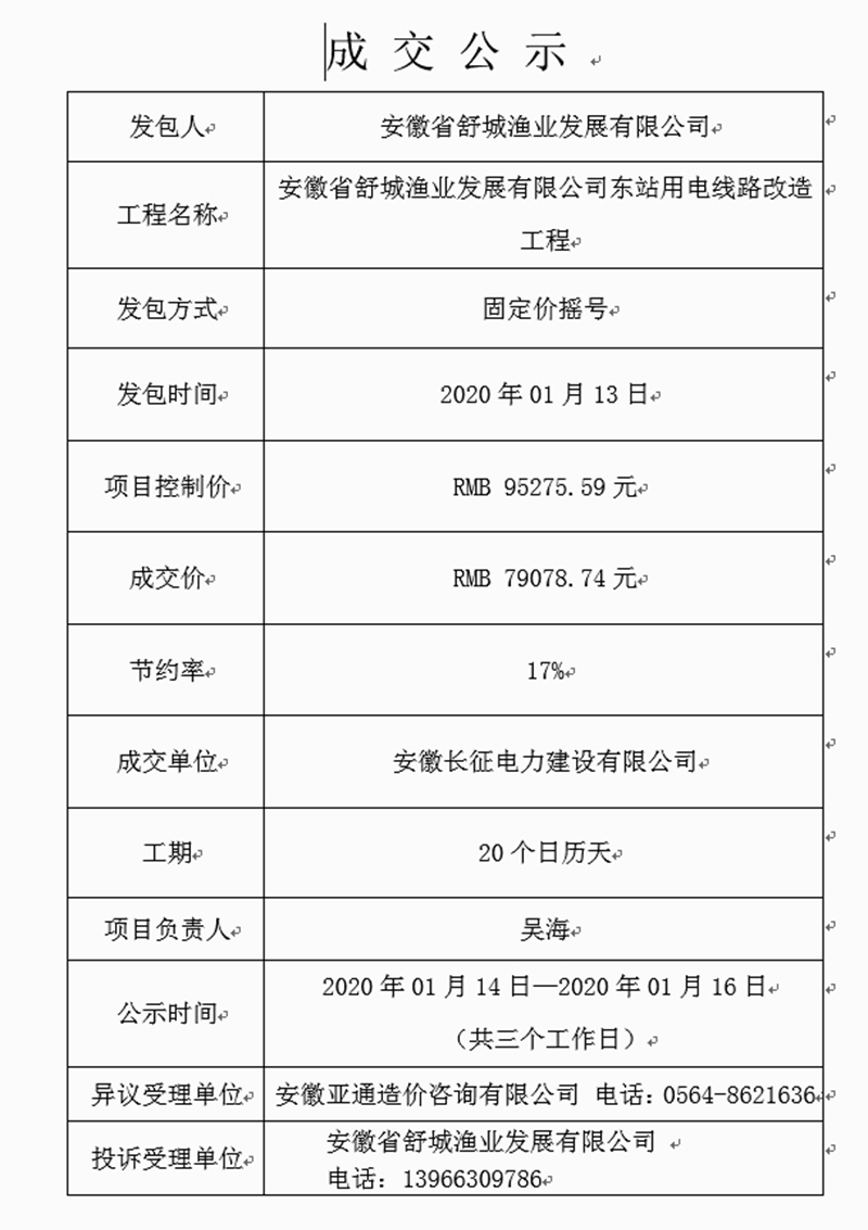 萬(wàn)佛湖漁業(yè)公司東站電路改造項(xiàng)目成交公示